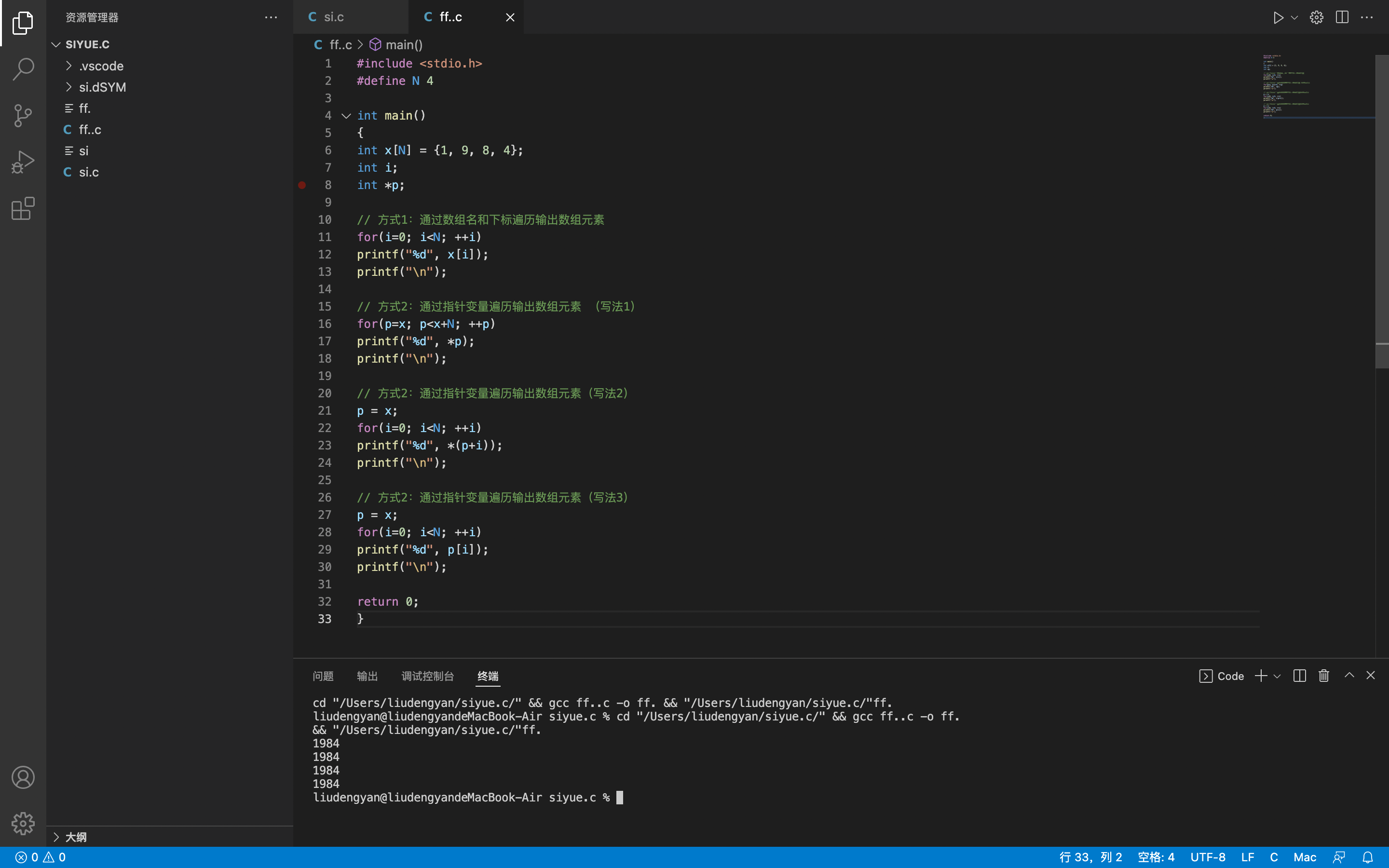#include <stdio.h> #define N 4 int main() { int x[N] = {1, 9, 8, 4}; int i; int *p; // 方式1:通过数组名和下标遍历输出数组元素 for(i=0; i<N; ++i) printf("%d", x[i]); printf("\n"); // 方式2:通过指针变量遍历输出数组元素 (写法1) for(p=x; p<x+N; ++p) printf("%d", *p); printf("\n"); // 方式2:通过指针变量遍历输出数组元素(写法2) p = x; for(i=0; i<N; ++i) printf("%d", *(p+i)); printf("\n"); // 方式2:通过指针变量遍历输出数组元素(写法3) p = x; for(i=0; i<N; ++i) printf("%d", p[i]); printf("\n"); return 0; }