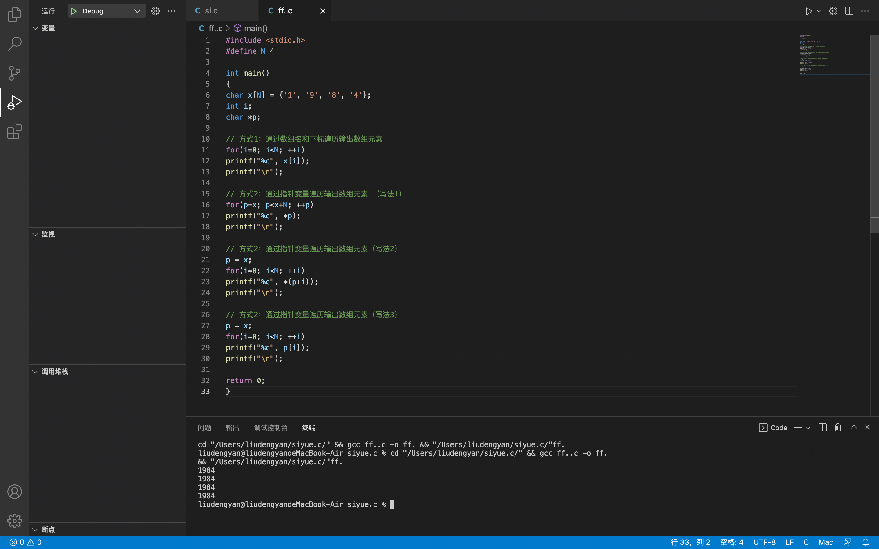 #include <stdio.h> #define N 4 int main() { char x[N] = {'1', '9', '8', '4'}; int i; char *p; // 方式1:通过数组名和下标遍历输出数组元素 for(i=0; i<N; ++i) printf("%c", x[i]); printf("\n"); // 方式2:通过指针变量遍历输出数组元素 (写法1) for(p=x; p<x+N; ++p) printf("%c", *p); printf("\n"); // 方式2:通过指针变量遍历输出数组元素(写法2) p = x; for(i=0; i<N; ++i) printf("%c", *(p+i)); printf("\n"); // 方式2:通过指针变量遍历输出数组元素(写法3) p = x; for(i=0; i<N; ++i) printf("%c", p[i]); printf("\n"); return 0; }