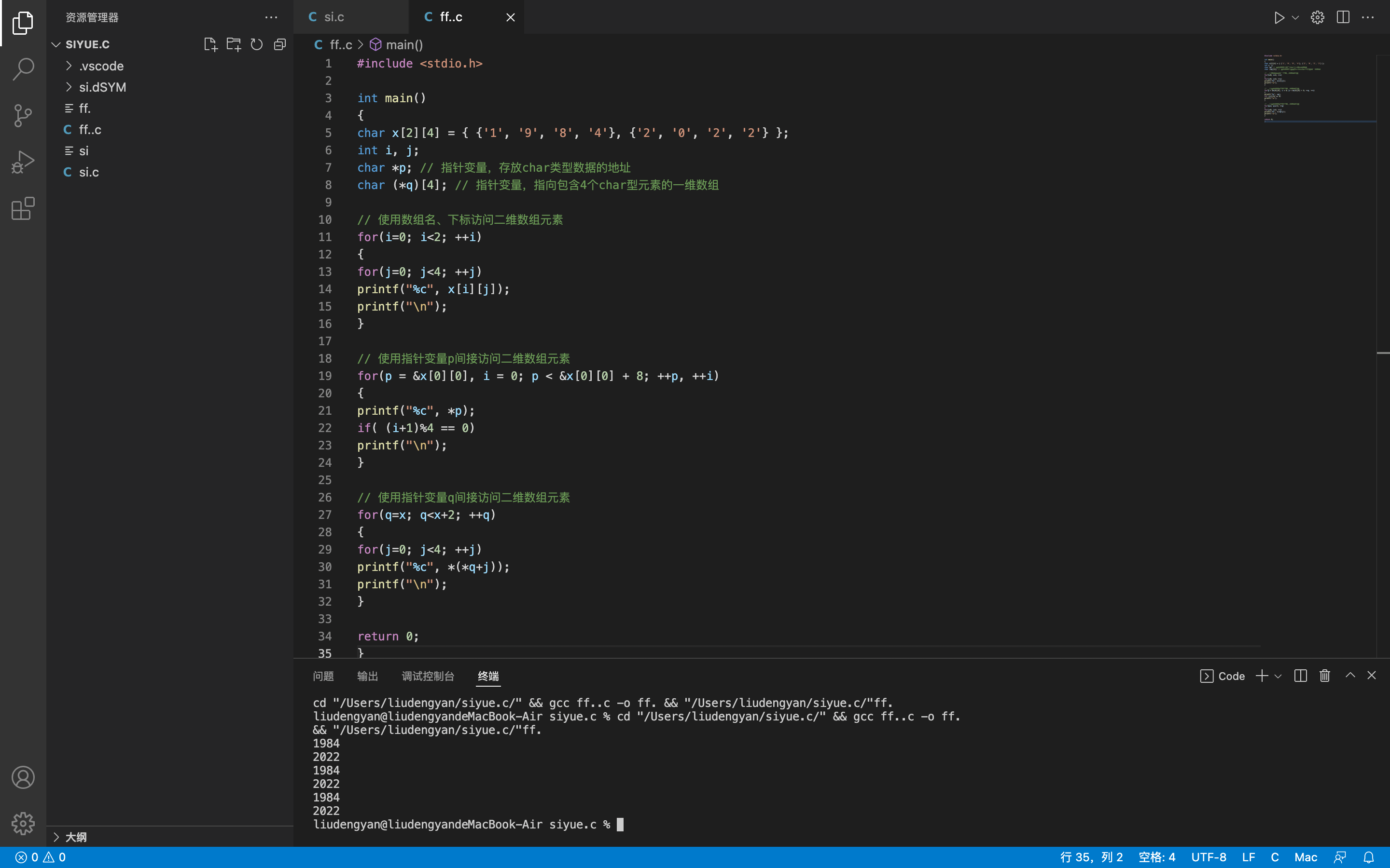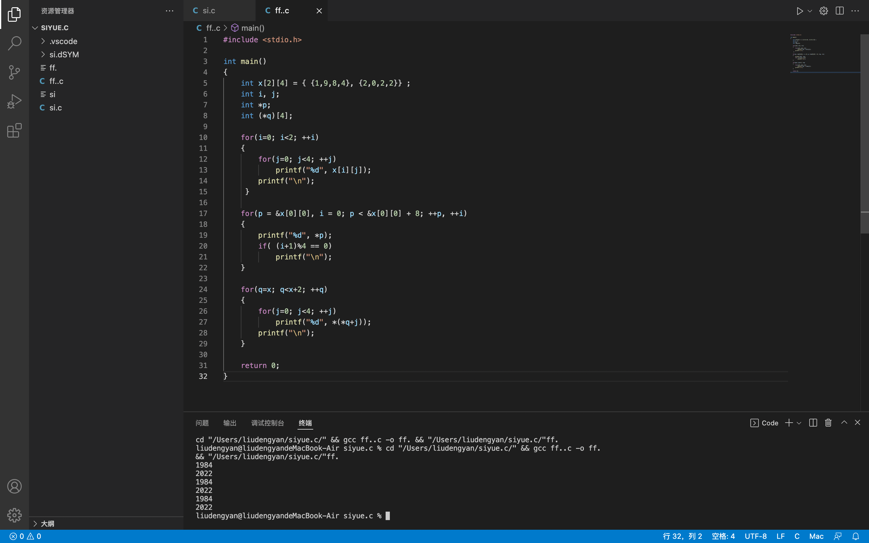 #include <stdio.h> int main() { int x[2][4] = { {1,9,8,4}, {2,0,2,2}} ; int i, j; int *p; int (*q)[4]; for(i=0; i<2; ++i) { for(j=0; j<4; ++j) printf("%d", x[i][j]); printf("\n"); } for(p = &x[0][0], i = 0; p < &x[0][0] + 8; ++p, ++i) { printf("%d", *p); if( (i+1)%4 == 0) printf("\n"); } for(q=x; q<x+2; ++q) { for(j=0; j<4; ++j) printf("%d", *(*q+j)); printf("\n"); } return 0; }