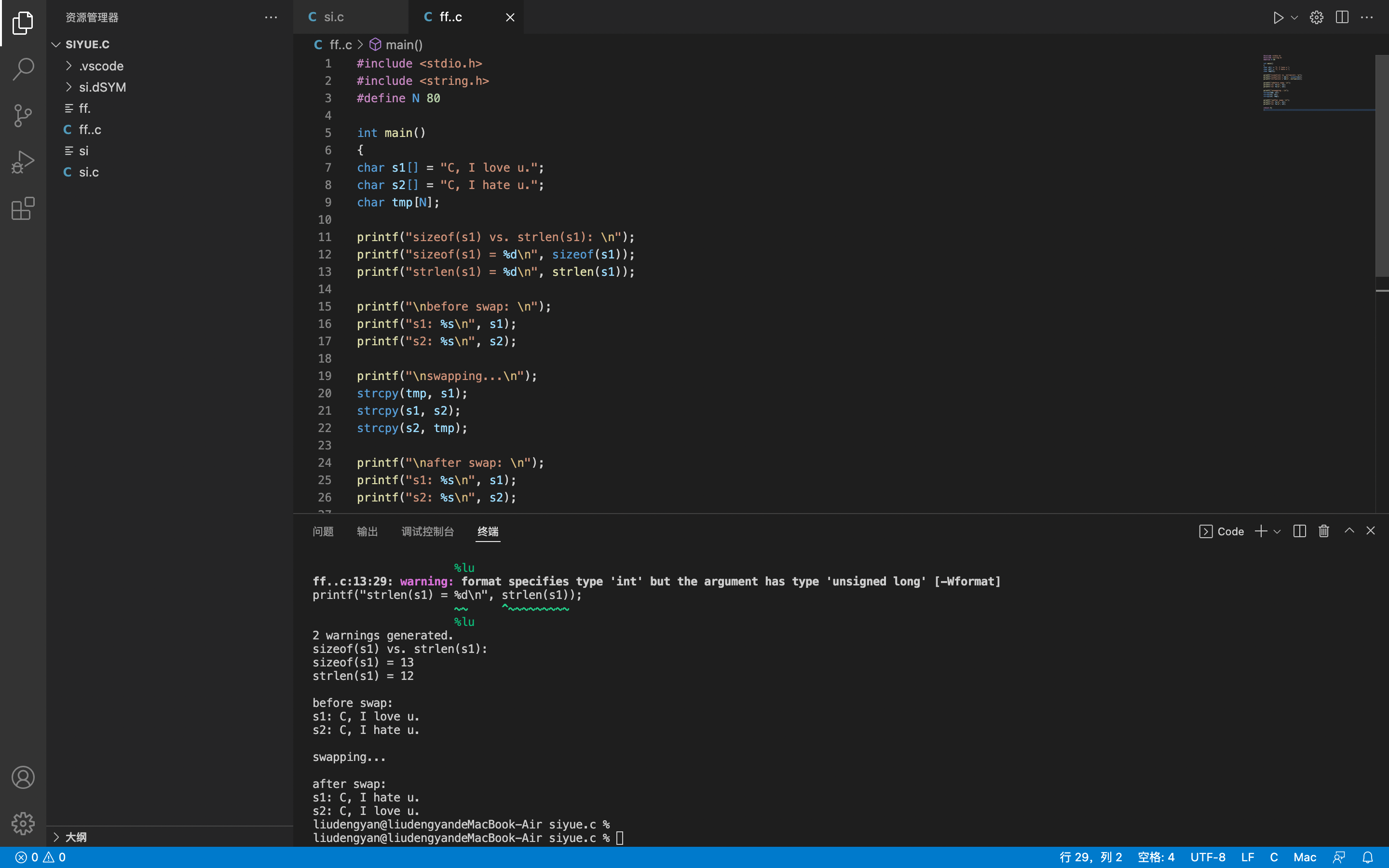 #include <stdio.h> #include <string.h> #define N 80 int main() { char *s1 = "C, I love u."; char *s2 = "C, I hate u."; char *tmp; printf("sizeof(s1) vs. strlen(s1): \n"); printf("sizeof(s1) = %d\n", sizeof(s1)); printf("strlen(s1) = %d\n", strlen(s1)); printf("\nbefore swap: \n"); printf("s1: %s\n", s1); printf("s2: %,s\n", s2); printf("\nswapping...\n"); tmp = s1; s1 = s2; s2 = tmp; printf("\nafter swap: \n"); printf("s1: %s\n", s1); printf("s2: %s\n", s2); return 0; }