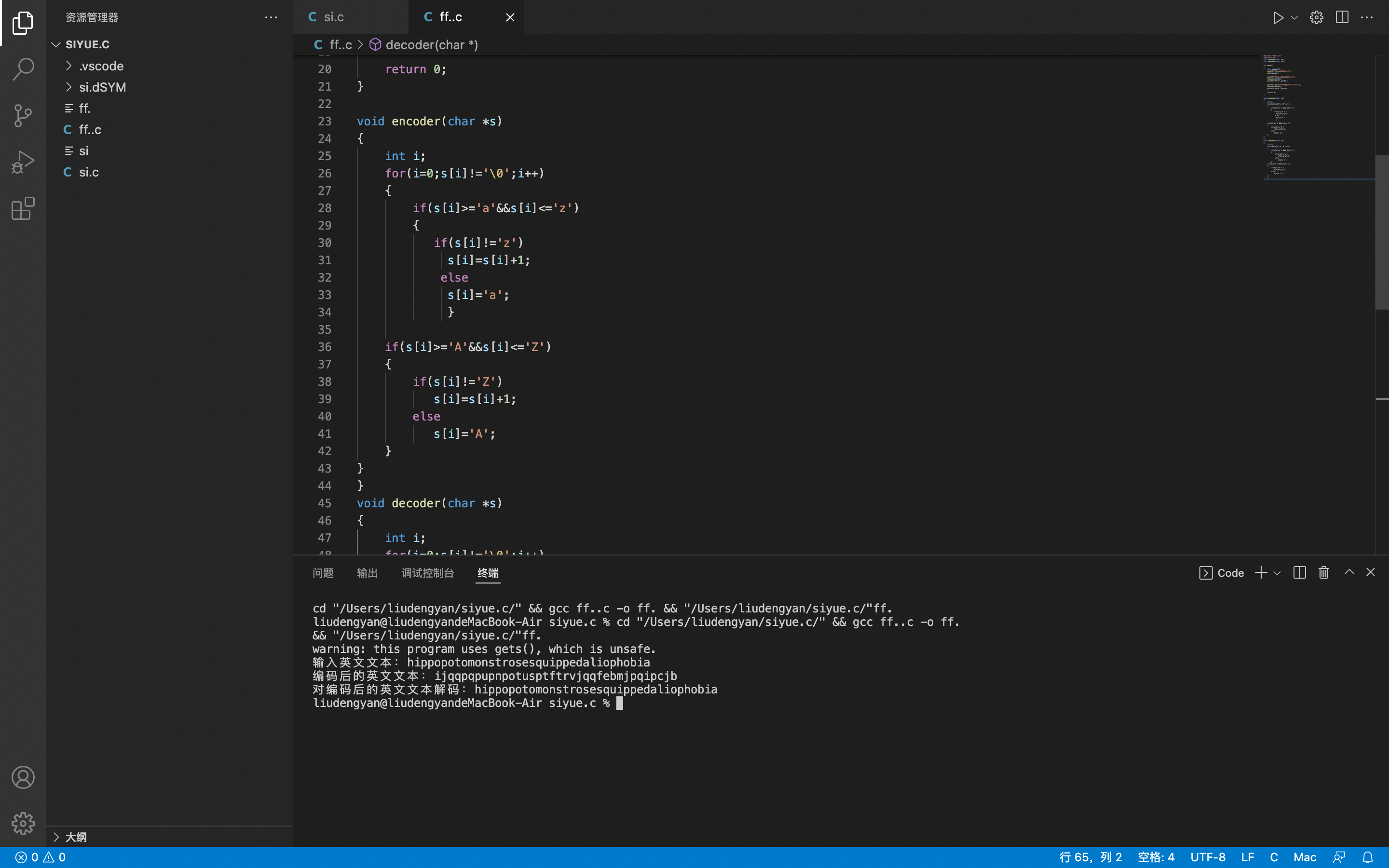 #include <stdio.h> #define N 80 void encoder(char *s); void decoder(char *s); int main() { char words[N]; printf("输入英文文本:"); gets(words); printf("编码后的英文文本:"); encoder(words); printf("%s\n",words); printf("对编码后的英文文本解码:"); decoder(words); printf("%s\n",words); return 0; } void encoder(char *s) { int i; for(i=0;s[i]!='\0';i++) { if(s[i]>='a'&&s[i]<='z') { if(s[i]!='z') s[i]=s[i]+1; else s[i]='a'; } if(s[i]>='A'&&s[i]<='Z') { if(s[i]!='Z') s[i]=s[i]+1; else s[i]='A'; } } } void decoder(char *s) { int i; for(i=0;s[i]!='\0';i++) { if(s[i]>='a'&&s[i]<='z') { if(s[i]!='a') s[i]=s[i]-1; else s[i]='z'; } if(s[i]>='A'&&s[i]<='Z') { if(s[i]!='A') s[i]=s[i]-1; else s[i]='Z'; } } }