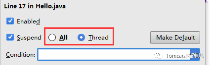 但是在IntelliJ IDEA里默认是没有开启的。也就是说如果你在IDEA里代码里加断点,虽然一个线程的断了下来,但其他线程的已经执行过了。此处把线程的suspend设置成和Eclipse模式一样之后,也可以开始多线程应用的调试。简单设置可以直接在断点处,将suspend改成Thread