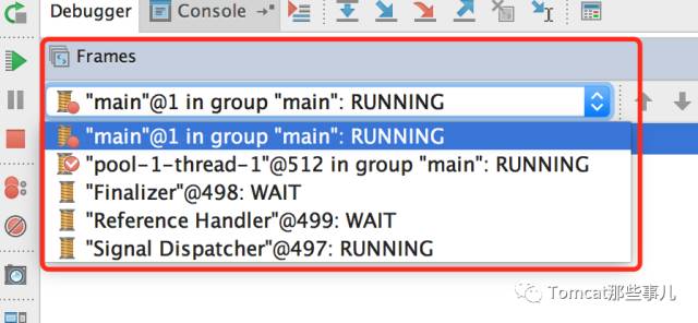 我们看到main线程和pool-1-thread-1这两个线程都处于RUNNING状态,切换到任何一个都可以继续运行。