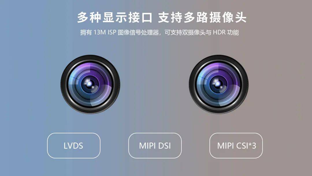 支持单路MIPI-DSI,支持到2048*1080@60fps,单通道LVDS,支持800*1280@60fps,拥有13M ISP图像信号处理器,可支持双摄像头与HDR功能,视频输入接口可外接摄像头或用于扩展多路摄像头的输入能力。
