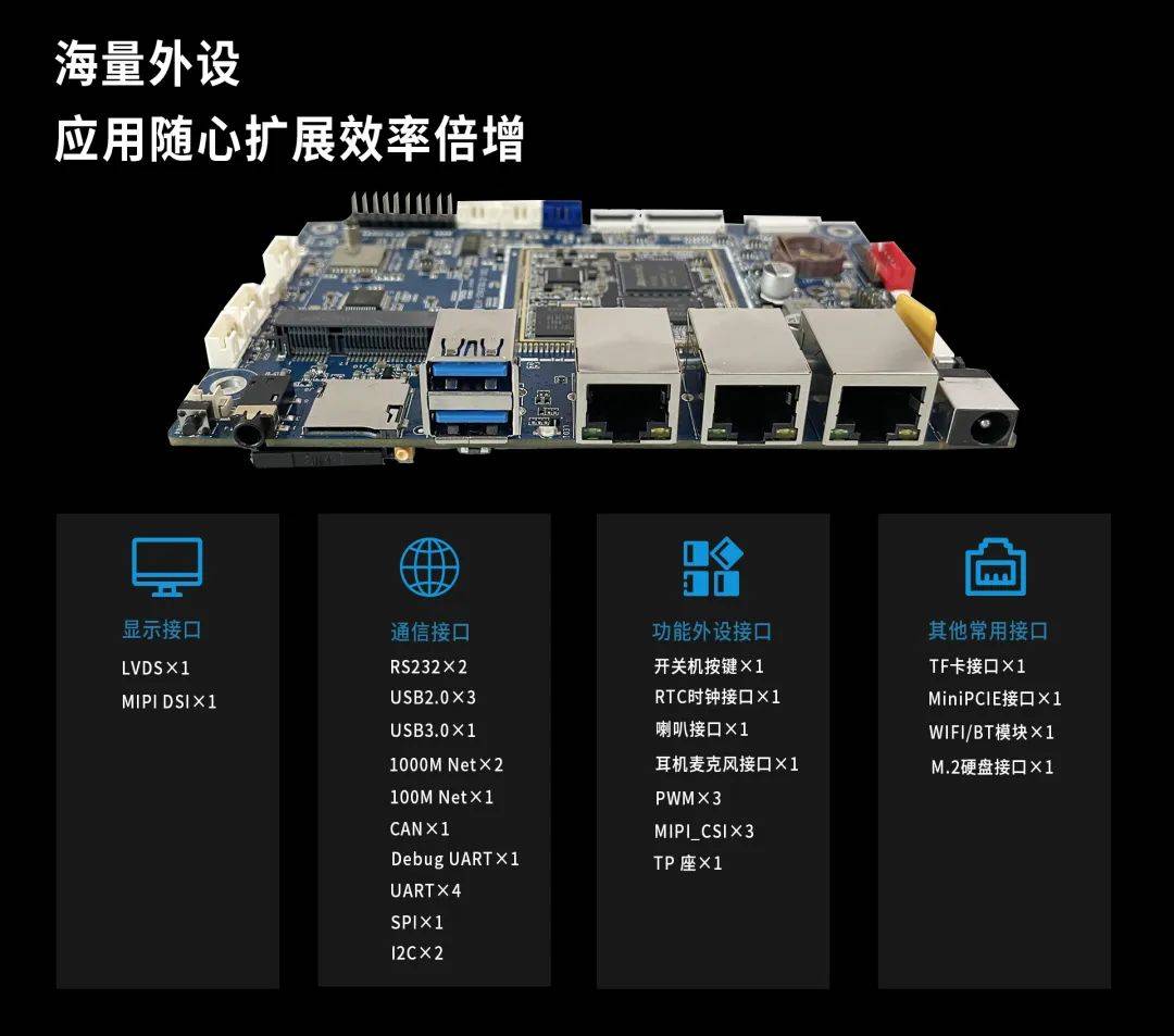RK3562系列产品采用 Rockchip 新一代 64 位处理器 RK3562(Quad-core ARM Cortex-A53,主频最高 2.0GHz),最大支持 8GB 内存;内置独立的 NPU,可用于轻量级人工智能应用,RK3562 拥有 PCIE2.1 / USB3.0 OTG / 双以太网等各类型接口,支持多种视频输入输出接口,拥有丰富的外部接口。