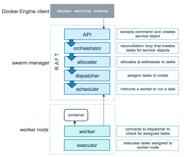 - API:这个请求直接由Swarm manager的API进行接收,接收命令并创建服务对象。