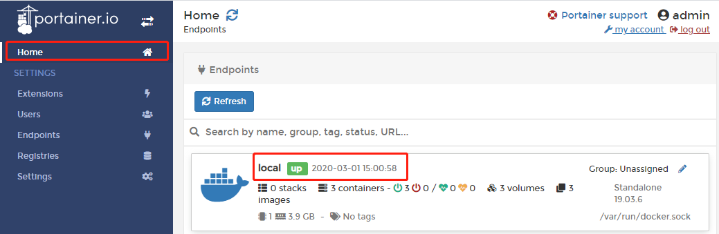 由于portainer支持local、remote、agent等形式来管理docker容器。我们这里是为了管理本地的docker容器,所以选择第一个local。