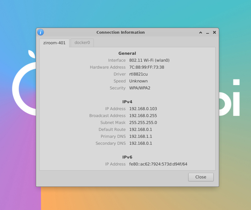 点击右上角WIFI标识,继续点击“查看连接信息”,获取其内网IP地址,我的为 192.168.0.103。