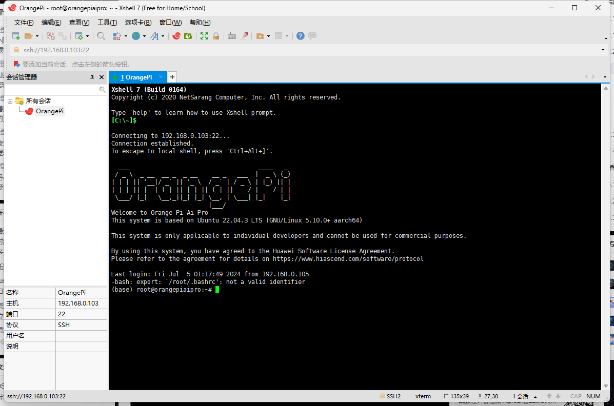 香橙派查看连接信息得到内网IP后,通过Xshell进行连接。
