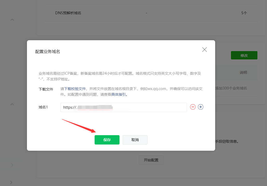 点击保存,提示保存成功。业务域名即刻生效,可以用小程序去调用业务域名下的后端接口了。