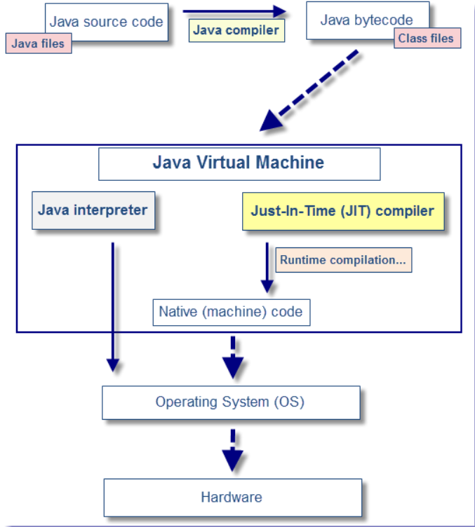 通过前端编译器将Java源文件编译为字节码文件。从字节码到机器码有两种选择,一种是使用Java解释器执行字节码,另一种则是使用JIT编译器转化为本地机器代码。