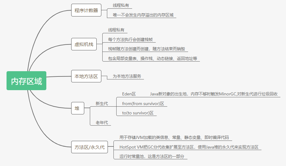 内存区域可分为线程私有区域【程序计数器、虚拟机栈、本地方法区】、线程共享区【Java堆、方法区】、直接内存。