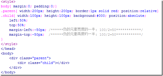 绝对定位进行居中的原理是通过把这个绝对定位元素的left或top的属性设为50%,这个时候元素并不是居中的,而是比居中的位置向右或向左偏了这个元素宽度或高度的一半的距离,所以需要使用一个负的margin-left或margin-top的值来把它拉回到居中的位置,这个负的margin值就取元素宽度或高度的一半。