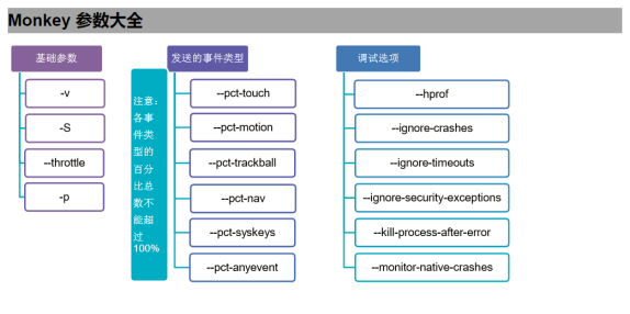 --pct-motion <percent> (滑动事件)、 --pct-trackball <percent> (轨迹球事件) 、 --pct-nav<percent> (导航事件 up/down/left/right)、 --pct-majornav<percent> (主要导航事件 back key 、 menu key)、 --pct-syskeys<percent> (系统按键事件 Home 、Back 、startCall 、 endCall 、 volumeControl)、 --pct-appswitch<percent> (activity之间的切换)、 --pct-anyevent<percent>(任意事件)