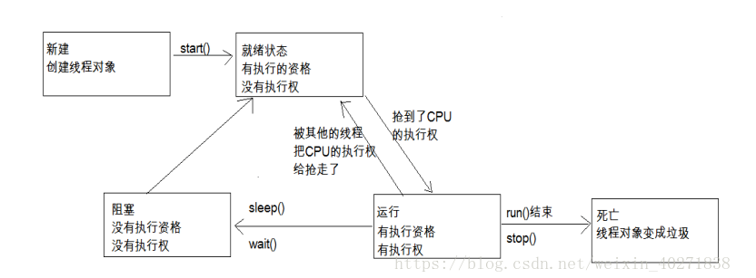 - 运行状态,如果处于就绪状态的线程获得了cpu,就执行run()方法的线程执行体。