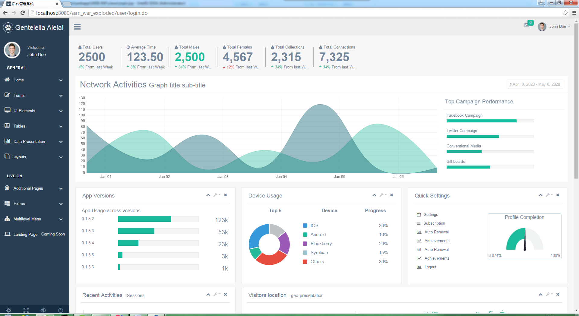 <%-- Created by IntelliJ IDEA. User: Administrator Date: 2020-05-08 Time: 11:10 To change this template use File | Settings | File Templates. --%> <%@ page contentType="text/html;charset=UTF-8" language="java" %> <html> <head> <meta http-equiv="Content-Type" content="text/html; charset=UTF-8"> <!-- Meta, title, CSS, favicons, etc. --> <meta charset="utf-8"> <meta http-equiv="X-UA-Compatible" content="IE=edge"> <meta name="viewport" content="width=device-width, initial-scale=1"> <link rel="icon" href="${pageContext.request.contextPath}/static/images/favicon.ico" type="image/ico" /> <title>后台管理系统</title> <!-- Bootstrap --> <link href="${pageContext.request.contextPath}/static/vendors/bootstrap/dist/css/bootstrap.min.css" rel="stylesheet"> <!-- Font Awesome --> <link href="${pageContext.request.contextPath}/static/vendors/font-awesome/css/font-awesome.min.css" rel="stylesheet"> <!-- NProgress --> <link href="${pageContext.request.contextPath}/static/vendors/nprogress/nprogress.css" rel="stylesheet"> <!-- iCheck --> <link href="${pageContext.request.contextPath}/static/vendors/iCheck/skins/flat/green.css" rel="stylesheet"> <!-- bootstrap-progressbar --> <link href="${pageContext.request.contextPath}/static/vendors/bootstrap-progressbar/css/bootstrap-progressbar-3.3.4.min.css" rel="stylesheet"> <!-- JQVMap --> <link href="${pageContext.request.contextPath}/static/vendors/jqvmap/dist/jqvmap.min.css" rel="stylesheet"/> <!-- bootstrap-daterangepicker --> <link href="${pageContext.request.contextPath}/static/vendors/bootstrap-daterangepicker/daterangepicker.css" rel="stylesheet"> <!-- Custom Theme Style --> <link href="${pageContext.request.contextPath}/static/css/custom.min.css" rel="stylesheet"> </head> <body class="nav-md"> <div class="container body"> <div class="main_container"> <div class="col-md-3 left_col"> <div class="left_col scroll-view"> <div class="navbar nav_title" style="border: 0;"> <a href="index.html" class="site_title"><i class="fa fa-paw"></i> <span>Gentelella Alela!</span></a> </div> <div class="clearfix"></div> <!-- menu profile quick info --> <div class="profile clearfix"> <div class="profile_pic"> <img src="${pageContext.request.contextPath}/static/images/img.jpg" alt="..." class="img-circle profile_img"> </div> <div class="profile_info"> <span>Welcome,</span> <h2>John Doe</h2> </div> </div> <!-- /menu profile quick info --> <br /> <!-- sidebar menu --> <div id="sidebar-menu" class="main_menu_side hidden-print main_menu"> <div class="menu_section"> <h3>General</h3> <ul class="nav side-menu"> <li><a><i class="fa fa-home"></i> Home <span class="fa fa-chevron-down"></span></a> <ul class="nav child_menu"> <li><a href="index.html">Dashboard</a></li> <li><a href="index2.html">Dashboard2</a></li> <li><a href="index3.html">Dashboard3</a></li> </ul> </li> <li><a><i class="fa fa-edit"></i> Forms <span class="fa fa-chevron-down"></span></a> <ul class="nav child_menu"> <li><a href="form.html">General Form</a></li> <li><a href="form_advanced.html">Advanced Components</a></li> <li><a href="form_validation.html">Form Validation</a></li> <li><a href="form_wizards.html">Form Wizard</a></li> <li><a href="form_upload.html">Form Upload</a></li> <li><a href="form_buttons.html">Form Buttons</a></li> </ul> </li> <li><a><i class="fa fa-desktop"></i> UI Elements <span class="fa fa-chevron-down"></span></a> <ul class="nav child_menu"> <li><a href="general_elements.html">General Elements</a></li> <li><a href="media_gallery.html">Media Gallery</a></li> <li><a href="typography.html">Typography</a></li> <li><a href="icons.html">Icons</a></li> <li><a href="glyphicons.html">Glyphicons</a></li> <li><a href="widgets.html">Widgets</a></li> <li><a href="invoice.html">Invoice</a></li> <li><a href="inbox.html">Inbox</a></li> <li><a href="calendar.html">Calendar</a></li> </ul> </li> <li><a><i class="fa fa-table"></i> Tables <span class="fa fa-chevron-down"></span></a> <ul class="nav child_menu"> <li><a href="tables.html">Tables</a></li> <li><a href="tables_dynamic.html">Table Dynamic</a></li> </ul> </li> <li><a><i class="fa fa-bar-chart-o"></i> Data Presentation <span class="fa fa-chevron-down"></span></a> <ul class="nav child_menu"> <li><a href="chartjs.html">Chart JS</a></li> <li><a href="chartjs2.html">Chart JS2</a></li> <li><a href="morisjs.html">Moris JS</a></li> <li><a href="echarts.html">ECharts</a></li> <li><a href="other_charts.html">Other Charts</a></li> </ul> </li> <li><a><i class="fa fa-clone"></i>Layouts <span class="fa fa-chevron-down"></span></a> <ul class="nav child_menu"> <li><a href="fixed_sidebar.html">Fixed Sidebar</a></li> <li><a href="fixed_footer.html">Fixed Footer</a></li> </ul> </li> </ul> </div> <div class="menu_section"> <h3>Live On</h3> <ul class="nav side-menu"> <li><a><i class="fa fa-bug"></i> Additional Pages <span class="fa fa-chevron-down"></span></a> <ul class="nav child_menu"> <li><a href="e_commerce.html">E-commerce</a></li> <li><a href="projects.html">Projects</a></li> <li><a href="project_detail.html">Project Detail</a></li> <li><a href="contacts.html">Contacts</a></li> <li><a href="profile.html">Profile</a></li> </ul> </li> <li><a><i class="fa fa-windows"></i> Extras <span class="fa fa-chevron-down"></span></a> <ul class="nav child_menu"> <li><a href="page_403.html">403 Error</a></li> <li><a href="page_404.html">404 Error</a></li> <li><a href="page_500.html">500 Error</a></li> <li><a href="plain_page.html">Plain Page</a></li> <li><a href="login.html">Login Page</a></li> <li><a href="pricing_tables.html">Pricing Tables</a></li> </ul> </li> <li><a><i class="fa fa-sitemap"></i> Multilevel Menu <span class="fa fa-chevron-down"></span></a> <ul class="nav child_menu"> <li><a href="#level1_1">Level One</a> <li><a>Level One<span class="fa fa-chevron-down"></span></a> <ul class="nav child_menu"> <li class="sub_menu"><a href="level2.html">Level Two</a> </li> <li><a href="#level2_1">Level Two</a> </li> <li><a href="#level2_2">Level Two</a> </li> </ul> </li> <li><a href="#