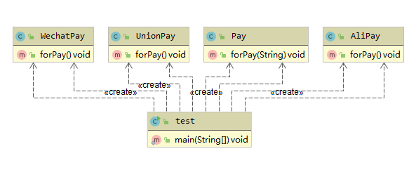 /** * Created on 2020/5/30. * * @author haiyu Liu */ public class Pay { //在这个方法中,写入了三种支持方式,当一个改变时,可能影响另外一下,实现的代码职责也有可能不同。 public void forPay(String paytype){ if("wxpay".equals(paytype)){ System.out.println("欢迎使用微信支付"); }else if("alipay".equals(paytype)){ System.out.println("欢迎使用支付宝支付"); }else{ System.out.println("欢迎银联支付"); } } } package com.liuhy.sdp.srp; /** * Created on 2020/5/30. * * @author haiyu Liu */ public class AliPay { public void forPay(){ System.out.println("欢迎使用支付宝支付"); } } package com.liuhy.sdp.srp; /** * Created on 2020/5/30. * * @author haiyu Liu */ public class UnionPay { public void forPay(){ System.out.println("欢迎银联支付"); } } package com.liuhy.sdp.srp; /** * Created on 2020/5/30. * * @author haiyu Liu */ public class WechatPay { public void forPay(){ System.out.println("欢迎使用微信支付"); } } package com.liuhy.sdp.srp; /** * Created on 2020/5/30. * * @author haiyu Liu */ public class test { public static void main(String[] args) { //在这个类中实现了多种支付试,不利于代码的维护 Pay pay=new Pay(); pay.forPay("wxpay"); //因此对支付方式,创建不同的类,实现不同的支付 //当然可以做一些顶层的接口设计 WechatPay wxpay=new WechatPay(); wxpay.forPay(); AliPay aliPay=new AliPay(); aliPay.forPay(); UnionPay unionPay=new UnionPay(); unionPay.forPay(); } }