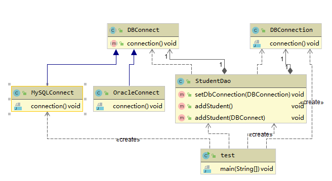 package com.liuhy.sdp.carp; /** * Created on 2020/5/30. * * @author haiyu Liu */ public abstract class DBConnect { public abstract void connection(); } package com.liuhy.sdp.carp; /** * Created on 2020/5/30. * * @author haiyu Liu */ public class DBConnection { public void connection(){ System.out.println("我是MySQL数据库连接"); } } package com.liuhy.sdp.carp; /** * Created on 2020/5/30. * * @author haiyu Liu */ public class MySQLConnect extends DBConnect { @Override public void connection() { System.out.println("我是MySQL连接"); } } package com.liuhy.sdp.carp; /** * Created on 2020/5/30. * * @author haiyu Liu */ public class OracleConnect extends DBConnect { @Override public void connection() { System.out.println("我是Oracle连接"); } } package com.liuhy.sdp.carp; /** * Created on 2020/5/30. * * @author haiyu Liu */ public class StudentDao { //尽量使用组合、聚合关系,而不是使用继承关系达到复用目的,降低类与类之间的耦合度。 //有利于扩展,因此建立一个DBconnet抽象类,MySQLConnect,OracleConnect实现类 private DBConnection dbConnection; private DBConnect dbConnect; public void setDbConnection(DBConnection dbConnection) { this.dbConnection = dbConnection; } public void addStudent(){ System.out.println(dbConnection+"增加一个学生"); } public void addStudent(DBConnect dbConnect){ this.dbConnect=dbConnect; System.out.println(dbConnect+"增加一个学生"); } } package com.liuhy.sdp.carp; /** * Created on 2020/5/30. * * @author haiyu Liu */ public class test { public static void main(String[] args) { StudentDao studentDao=new StudentDao(); studentDao.setDbConnection(new DBConnection()); studentDao.addStudent(); // studentDao.addStudent(new MySQLConnect()); } }