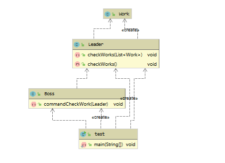 package com.liuhy.sdp.lod; import java.util.ArrayList; import java.util.List; /** * Created on 2020/5/30. * * @author haiyu Liu */ public class Boss { public void commandCheckWork(Leader leader){ // List<Work> workList=new ArrayList<Work>(); // for(int i=0;i<5;i++){ // workList.add(new Work(i)); // } // leader.checkWorks(workList); //检查完工作,向boss汇报一下就成了,不想知道leader具体怎么检查的 leader.checkWorks(); } } package com.liuhy.sdp.lod; import java.util.ArrayList; import java.util.List; /** * Created on 2020/5/30. * * @author haiyu Liu */ public class Leader { public void checkWorks(List<Work> workList){ System.out.println("检查工作数量:"+workList.size()); } public void checkWorks(){ List<Work> workList=new ArrayList<Work>(); for(int i=0;i<5;i++){ workList.add(new Work(i)); } System.out.println("检查工作数量:"+workList.size()); } } package com.liuhy.sdp.lod; /** * Created on 2020/5/30. * * @author haiyu Liu */ public class Work { public Work(Integer i){ System.out.println("我是第"+i+"项工作"); } } package com.liuhy.sdp.lod; /** * Created on 2020/5/30. * * @author haiyu Liu */ public class test { public static void main(String[] args) { //其实,老板不需要知道你检查工作的过程,也不需要知道具体的工作是什么,只需要检查完汇报给他就行了。 Boss boss=new Boss(); Leader leader=new Leader(); boss.commandCheckWork(leader); //因此,我们可以把检查工作的过程放到leader类中,因此修改了 leader.checkWorks(); } }