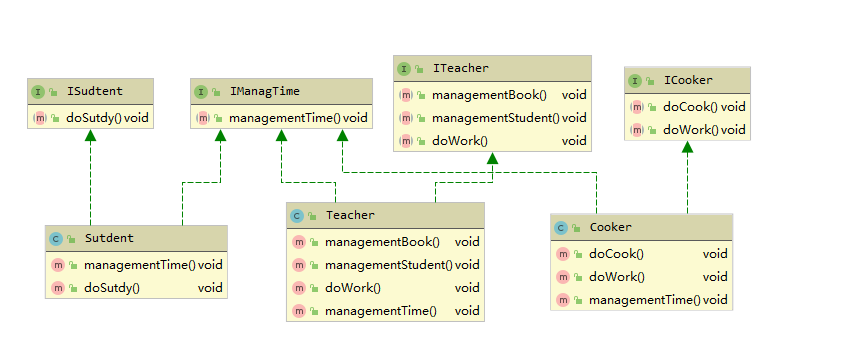 package com.liuhy.sdp.isp; /** * Created on 2020/5/30. * * @author haiyu Liu */ //public class Cooker implements IManagement { public class Cooker implements ICooker { // @Override // public void managementBook() { // System.out.println("厨师不用管理书"); // } // // @Override // public void managementStudent() { // System.out.println("厨师不用管理学生"); // } @Override public void doCook() { System.out.println("厨师用做饭"); } @Override public void doWork() { System.out.println("厨师用工作"); } @Override public void managementTime() { System.out.println("厨师管理时间"); } // @Override // public void doSutdy() { // System.out.println("厨师不用学习"); // } } package com.liuhy.sdp.isp; /** * Created on 2020/5/30. * * @author haiyu Liu */ public interface ICooker { void doCook(); void doWork(); void managementTime(); } package com.liuhy.sdp.isp; /** * Created on 2020/5/30. * * @author haiyu Liu */ public interface IManagement { //在这个接口中有教师、学生、厨师的一个些工作,其中有些需要分别实现的的,有些不需要实现的 void managementBook(); void managementStudent(); void doCook(); void doWork(); void managementTime(); void doSutdy(); //根据接口隔离原则,应该建立一个单一的接口,类对接口的依赖应该是最小的,接口的方法要适度,因此 //我们把接口进行细化,并拆分成三个接口。 } package com.liuhy.sdp.isp; /** * Created on 2020/5/30. * * @author haiyu Liu */ public interface ISudtent { void managementTime(); void doSutdy(); } package com.liuhy.sdp.isp; /** * Created on 2020/5/30. * * @author haiyu Liu */ public interface ITeacher { void managementBook(); void managementStudent(); void doWork(); void managementTime(); } package com.liuhy.sdp.isp; /** * Created on 2020/5/30. * * @author haiyu Liu */ //public class Sutdent implements IManagement { public class Sutdent implements ISudtent { // @Override // public void managementBook() { // System.out.println("学生不用管理书"); // } // // @Override // public void managementStudent() { // System.out.println("学生不用管理学生"); // } // // @Override // public void doCook() { // System.out.println("学生不用做饭"); // } // // @Override // public void doWork() { // System.out.println("学生不用工作"); // } @Override public void managementTime() { System.out.println("学生管理时间"); } @Override public void doSutdy() { System.out.println("学生应该学习"); } } package com.liuhy.sdp.isp; /** * Created on 2020/5/30. * * @author haiyu Liu */ //public class Teacher implements IManagement { public class Teacher implements ITeacher { @Override public void managementBook() { System.out.println("老师用管理书"); } @Override public void managementStudent() { System.out.println("老师用管理学生"); } // @Override // public void doCook() { // System.out.println("老师不用做饭"); // } @Override public void doWork() { System.out.println("老师用工作"); } @Override public void managementTime() { System.out.println("老师管理时间"); } // @Override // public void doSutdy() { // System.out.println("老师不用学习"); // } } package com.liuhy.sdp.isp; /** * Created on 2020/5/30. * * @author haiyu Liu */ public interface IManagTime { void managementTime(); }