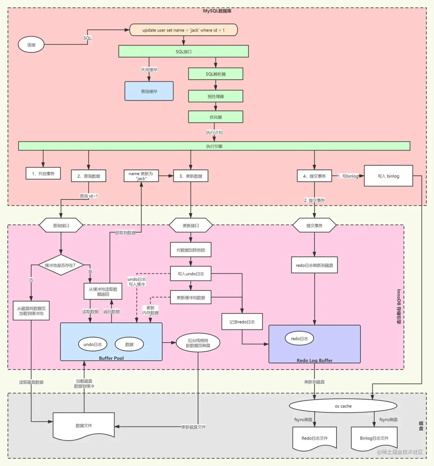 - 最底层的一部分就是磁盘上的数据文件、日志文件等,可以看到,InnoDB 设计了缓冲池来缓冲数据、undolog、redolog 等,这些内存中的数据最终都是要刷新到磁盘中才能保证数据不丢失的。