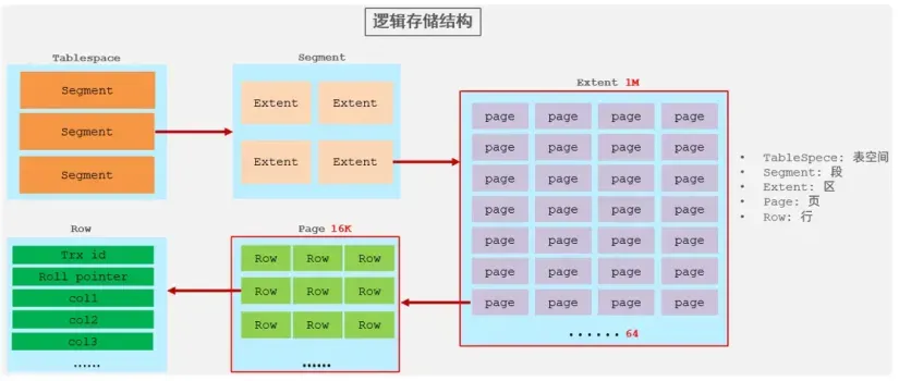 InnoDB将所有数据都存放在表空间中,表空间又由段(segment)、区(extent)、页(page)组成。InnoDB存储引擎的逻辑存储结构大致如下图。