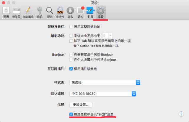 4 如果mac上的safari没有开发选项,则点击safari->偏好设置->高级->在菜单栏中显示『开发』菜单,如图3.2.4.1与图3.2.4.2,之后,safari的菜单栏中就会出现『开发』选项。