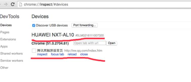 5 新开chrome的tab,输入chrome://inspect/,进入调试页面。此时,我们发现,chrome检测到了我们的手机,与我们手机chrome上运行的网页,如图2.2.5。