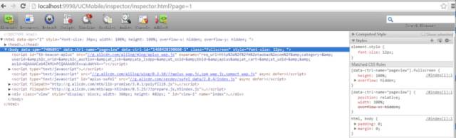 7 在浏览器中输入localhost:9998,可以看到我们在手机上的UC开发者版打开的页面,如图4.2.7.1,点击进入此页面的调试,如图4.2.7.2