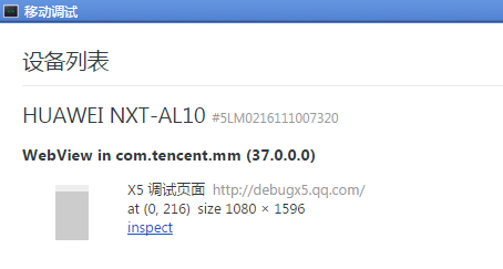 3 使用微信,打开网页,之后点击"开始调试"(如图5.2.3),弹出如图5.2.4的调试列表。点击需要调试的页面下方的inspect进行调试,弹出调试工具,如图5.2.5。