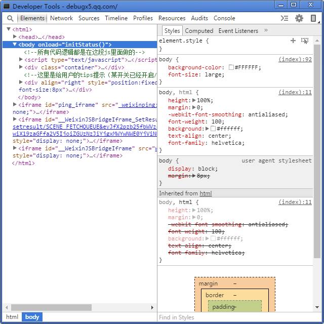 如果上述所说的所有浏览器均没有出问题,但是偏偏有些浏览器下,自己的网页发生了问题,可是这个浏览器又没有解决方案的话。我们的秘密武器weinre就要登场了。它可以调试所有浏览器。其原理是在要调试的页面上加上一段js,再由这段js,支持电脑与手机的调试与调用。由于weinre的原理是注入js,微信等内置浏览器也可以使用weinre进行调试。