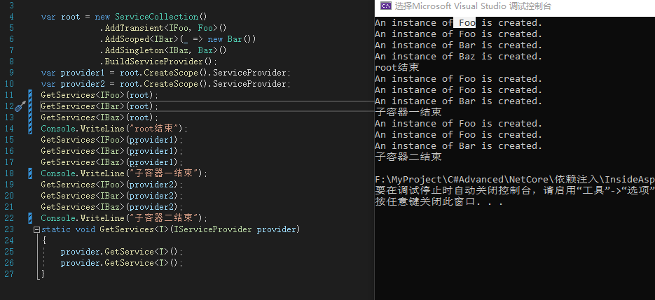 通过上图可知, 容器中 Transient 的foo 被每个容器创建,scoped 的 ber 也在每个容器中创建 ,二 单例的 baz 只在根容器中创建