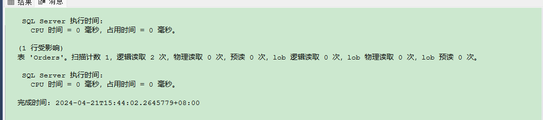 /****** SSMS 的 SelectTopNRows 命令的脚本 ******/ set statistics time on set statistics io on SELECT TOP (1000) [ID] ,[CreateTime] ,[ProductID] ,[Count] FROM [Order].[dbo].[Orders]