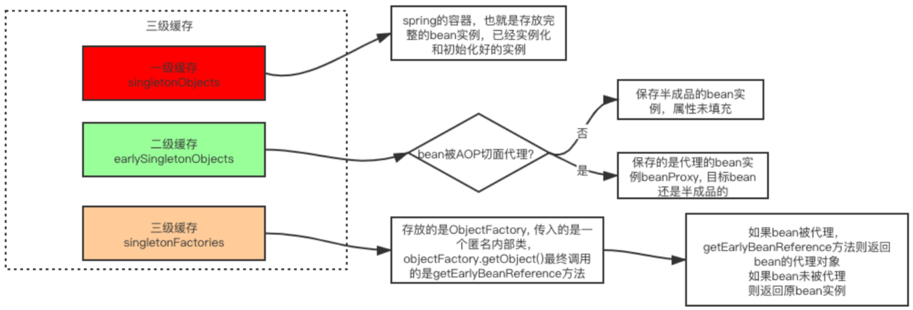 ② 如果只要一级、三级缓存,能处理部分问题。但是有一个前提这个 bean 没被 AOP 进行切面代理,如果这个 bean 被 AOP 进行了切面代理,那么只使用两个缓存是无法解决问题。因为要保证多次获取都是同一个代理对象。