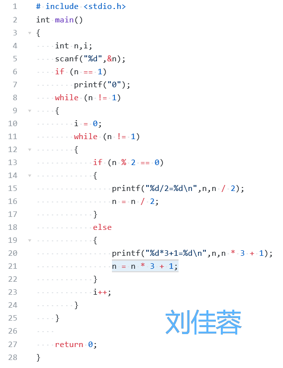 题目内容描述:日本数学家古角静夫研究自然数时,发现一个有趣现象:“如果是个偶数就除2,如果是奇数就乘以3加1”,经过有限个这样的处理步骤,最后一定能得到1. 任意输入一个自然数,给出得到结果1的运算过程。