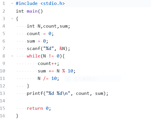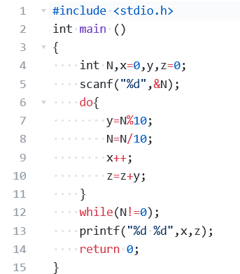 题目内容描述:对于给定的正整数N,求它的位数及其各位数字之和。