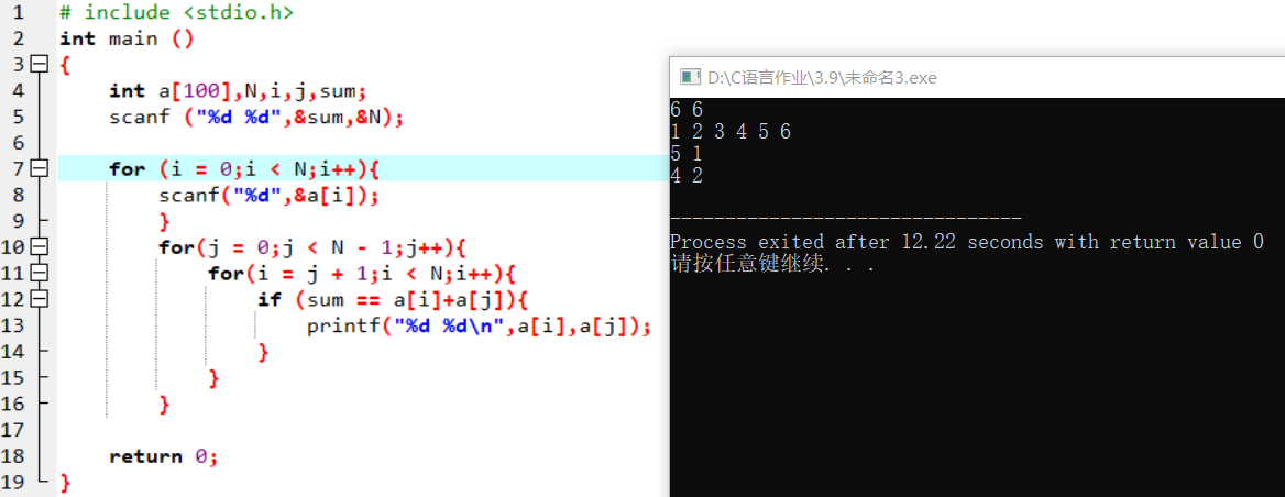解法一:采用穷举法,从数组中任意取出两个数字,计算两者之和是否为给定的数字。