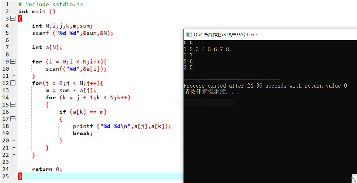 解法二:对数组中的每个数字arr[i]都判别Sum-arr[i]是否在数组中。