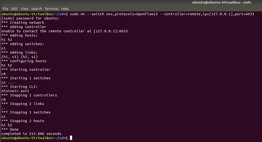 $ sudo mn --switch ovs,protocols=OpenFlow13 --controller=remote,ip=[此处填入控制器所在