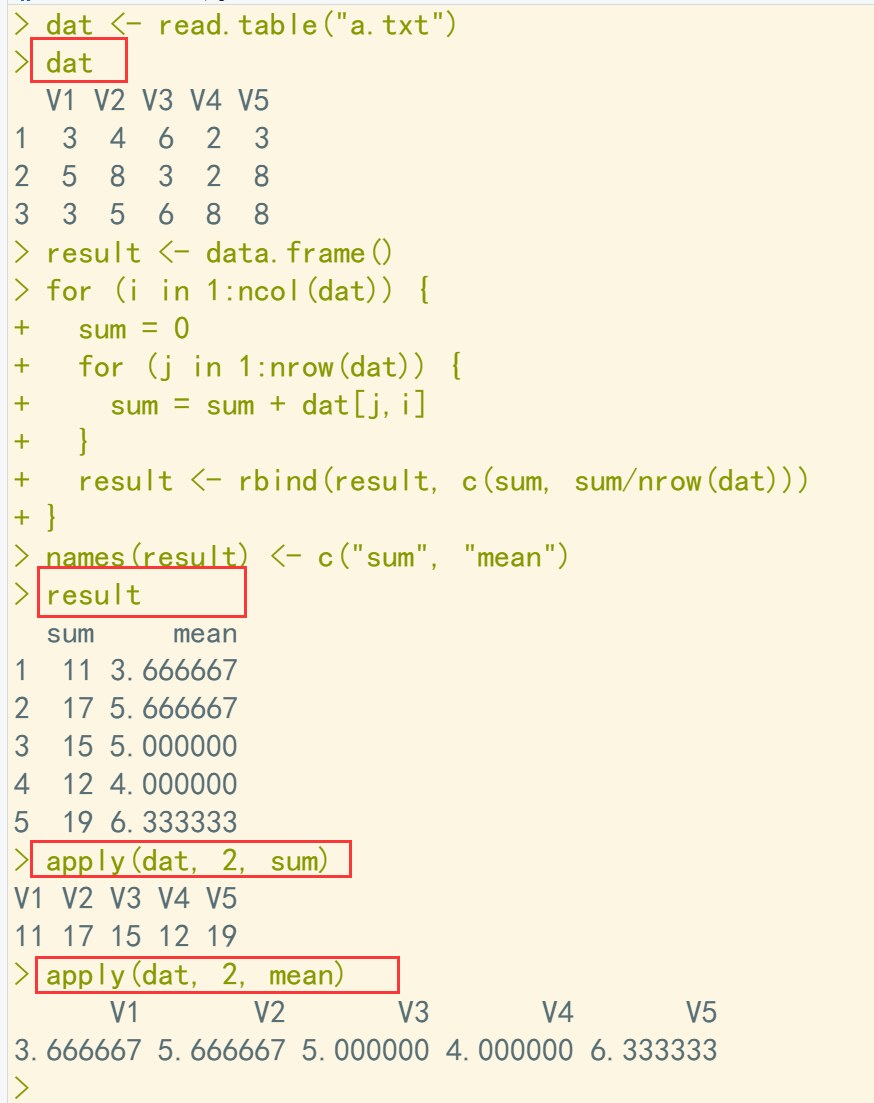 dat <- read.table("a.txt") dat result <- data.frame() for (i in 1:ncol(dat)) { sum = 0 for (j in 1:nrow(dat)) { sum = sum + dat[j,i] } result <- rbind(result, c(sum, sum/nrow(dat))) } names(result) <- c("sum", "mean") result apply(dat, 2, sum) ## apply验证 apply(dat, 2, mean)