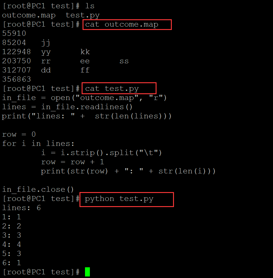 [root@PC1 test]# ls outcome.map test.py [root@PC1 test]# cat outcome.map ## 测试数据 55910 85204 jj 122948 yy kk 203750 rr ee ss 312707 dd ff 356863 [root@PC1 test]# cat test.py ## 测试脚本 in_file = open("outcome.map", "r") lines = in_file.readlines() print("lines: " + str(len(lines))) row = 0 for i in lines: i = i.strip().split("\t") row = row + 1 print(str(row) + ": " + str(len(i))) in_file.close() [root@PC1 test]# python test.py ## 执行程序,同时统计行数和列数 lines: 6 1: 1 2: 2 3: 3 4: 4 5: 3 6: 1