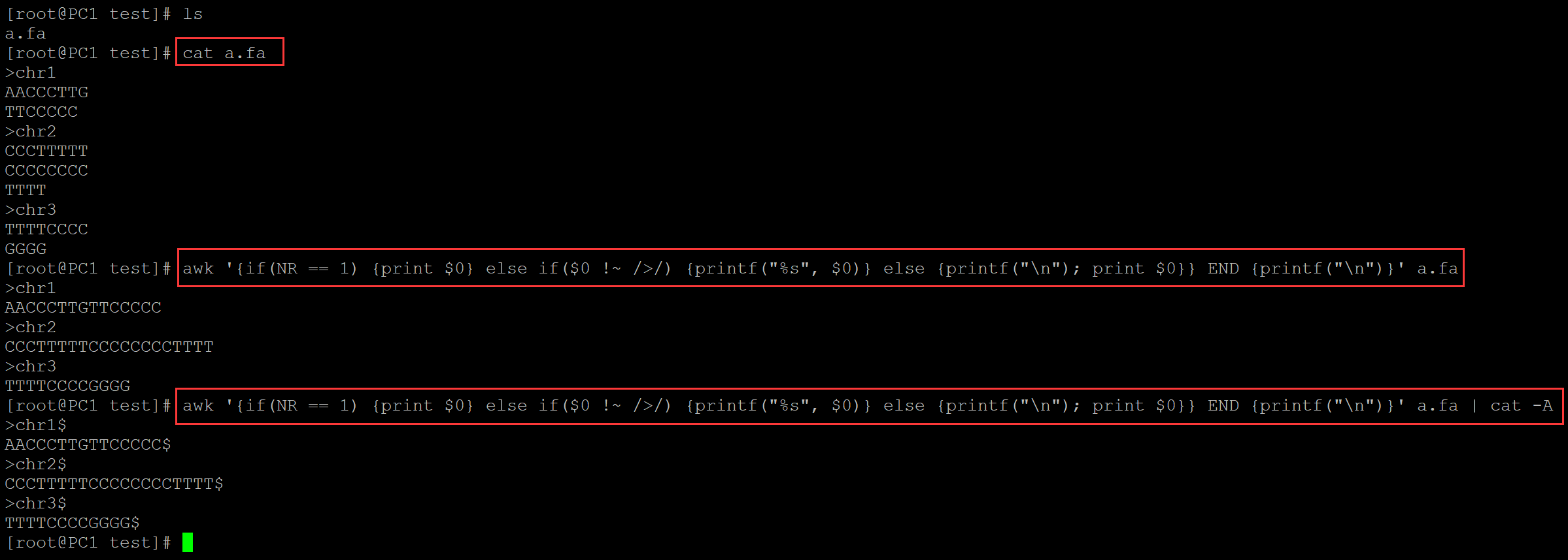 [root@PC1 test]# ls a.fa [root@PC1 test]# cat a.fa ## 测试fasta文件 >chr1 AACCCTTG TTCCCCC >chr2 CCCTTTTT CCCCCCCC TTTT >chr3 TTTTCCCC GGGG [root@PC1 test]# awk '{if(NR == 1) {print $0} else if($0 !~ />/) {printf("%s", $0)} else {printf("\n"); print $0}} END {printf("\n")}' a.fa ## 将每条scaffold的碱基转换为1行 >chr1 AACCCTTGTTCCCCC >chr2 CCCTTTTTCCCCCCCCTTTT >chr3 TTTTCCCCGGGG [root@PC1 test]# awk '{if(NR == 1) {print $0} else if($0 !~ />/) {printf("%s", $0)} else {printf("\n"); print $0}} END {printf("\n")}' a.fa | cat -A >chr1$ AACCCTTGTTCCCCC$ >chr2$ CCCTTTTTCCCCCCCCTTTT$ >chr3$ TTTTCCCCGGGG$