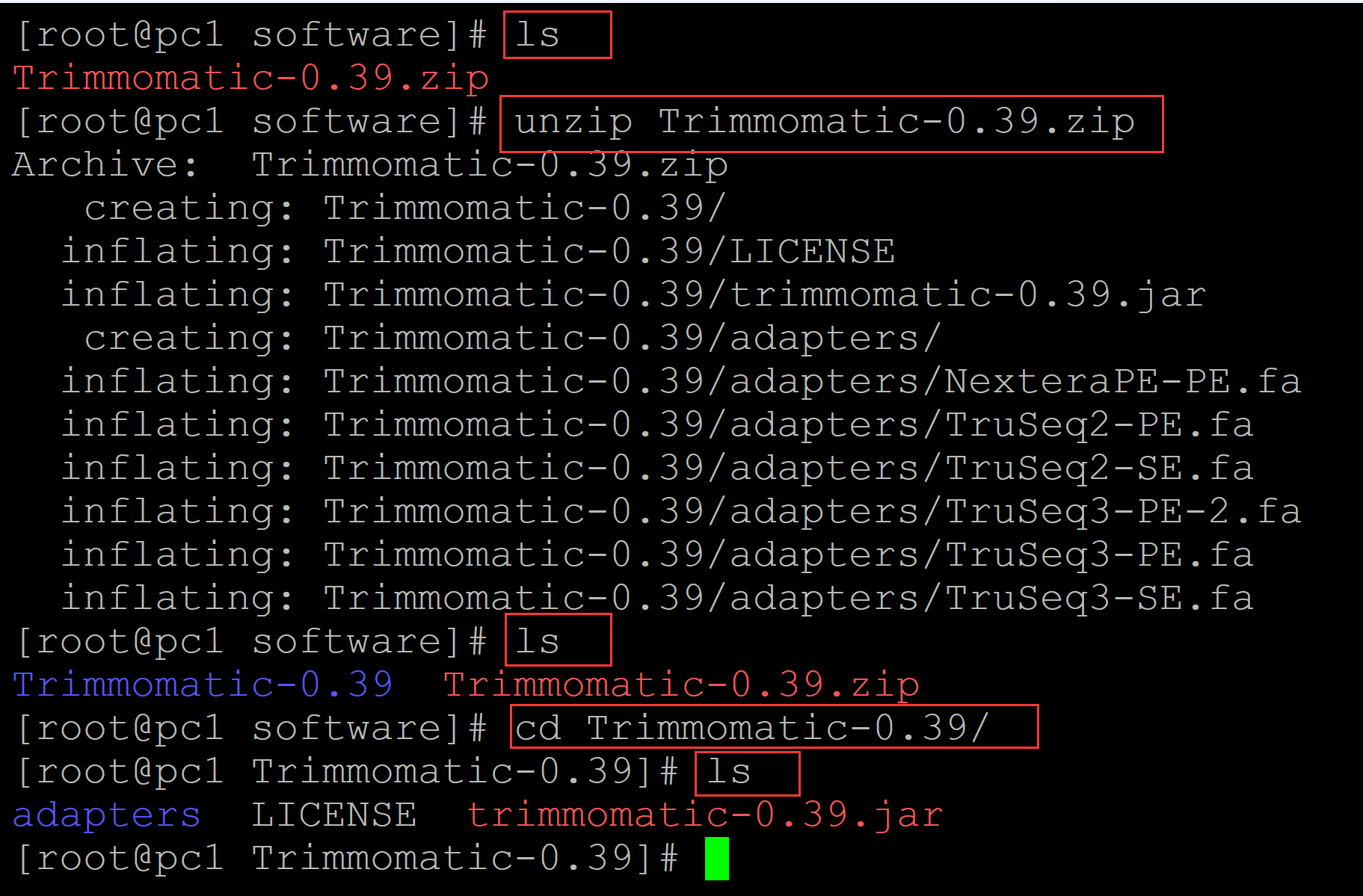 [root@pc1 software]# ls ## 列出安装包 Trimmomatic-0.39.zip [root@pc1 software]# unzip Trimmomatic-0.39.zip ## 解压 Archive: Trimmomatic-0.39.zip creating: Trimmomatic-0.39/ inflating: Trimmomatic-0.39/LICENSE inflating: Trimmomatic-0.39/trimmomatic-0.39.jar creating: Trimmomatic-0.39/adapters/ inflating: Trimmomatic-0.39/adapters/NexteraPE-PE.fa inflating: Trimmomatic-0.39/adapters/TruSeq2-PE.fa inflating: Trimmomatic-0.39/adapters/TruSeq2-SE.fa inflating: Trimmomatic-0.39/adapters/TruSeq3-PE-2.fa inflating: Trimmomatic-0.39/adapters/TruSeq3-PE.fa inflating: Trimmomatic-0.39/adapters/TruSeq3-SE.fa [root@pc1 software]# cd Trimmomatic-0.39/ ## 进入解压目录 [root@pc1 Trimmomatic-0.39]# ls ## 可执行java程序 adapters LICENSE trimmomatic-0.39.jar