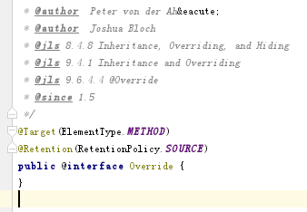 1 import java.lang.annotation.*; 2 @Target(value = {ElementType.TYPE,ElementType.FIELD,ElementType.METHOD}) 3 @Retention(RetentionPolicy.RUNTIME) 4 @Documented 5 //可以抽取到文档中 6 @Inherited 7 public @interface MyAnno3 { 8 }
