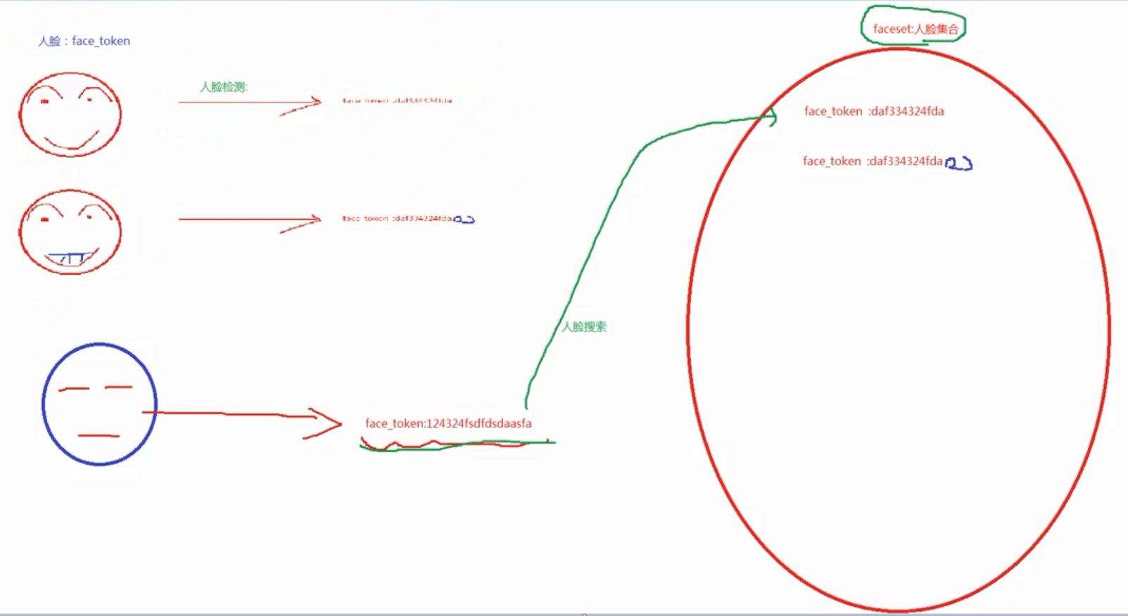 - face_token:当对一张图片进行人脸检测时,会将检测到的人脸记录下来,包括人脸在图片中的位置,用一个系统标识face_token来表示。