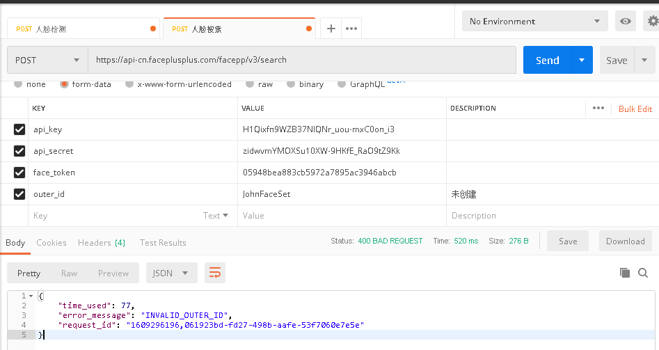 1、使用Postman工具模拟浏览器发送请求,调用api的人脸检测和人脸搜索