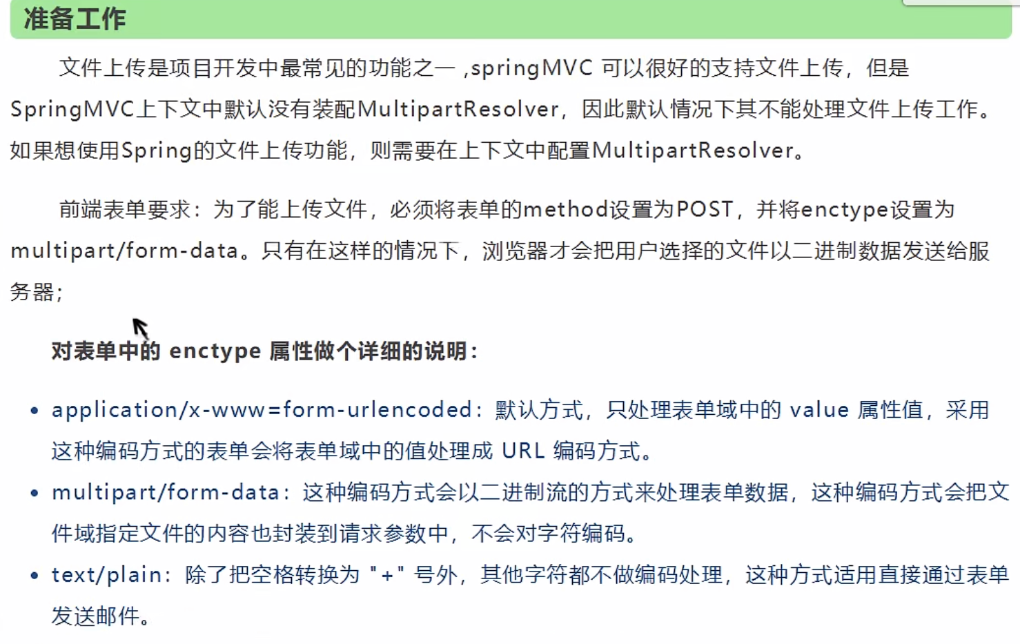 <!-- 文件上传 id固定--> <bean id="multipartResolver" class="org.springframework.web.multipart.commons.CommonsMultipartResolver"> <!-- 请求的编码格式.需要与JSP编码一致,默认的是ISO-8859-1--> <property name="defaultEncoding" value="utf-8"/> <!-- 文件上传大小限制[可省略] 单位:字节 (10M)--> <property name="maxUploadSize" value="10485760"/> <property name="maxInMemorySize" value="40960"/> </bean>