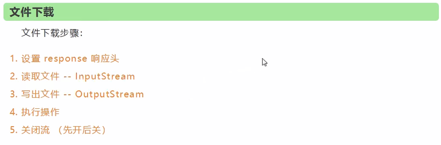 @RequestMapping(value="/download") public String downloads(HttpServletResponse response , HttpServletRequest request) throws Exception{ //要下载的图片地址 upload 在橙色目录out-artifacts-下 String path = request.getServletContext().getRealPath("/upload"); String fileName = "基础语法.jpg"; //1、设置response 响应头 response.reset(); //设置页面不缓存,清空buffer response.setCharacterEncoding("UTF-8"); //字符编码 response.setContentType("multipart/form-data"); //二进制传输数据 //设置响应头 response.setHeader("Content-Disposition", "attachment;fileName="+ URLEncoder.encode(fileName, "UTF-8")); File file = new File(path,fileName); //2、 读取文件--输入流 InputStream input=new FileInputStream(file); //3、 写出文件--输出流 OutputStream out = response.getOutputStream(); byte[] buff =new byte[1024]; int index=0; //4、执行 写出操作 while((index= input.read(buff))!= -1){ out.write(buff, 0, index); out.flush(); } out.close(); input.close(); return "OK"; }