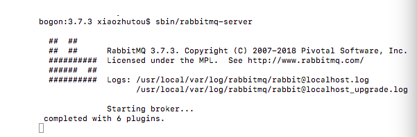 进入该目录(/usr/local/Cellar/rabbitmq/3.7.3)之后,输入sbin/rabbitmq-server指令,出现一下提示信息时rabbitmq启动成功: