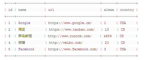 语句:select * from A where country='CN' or alexa>50 | 打印country为CN或者alexa大于50的数据,打印的实际结果为第2、3、4行